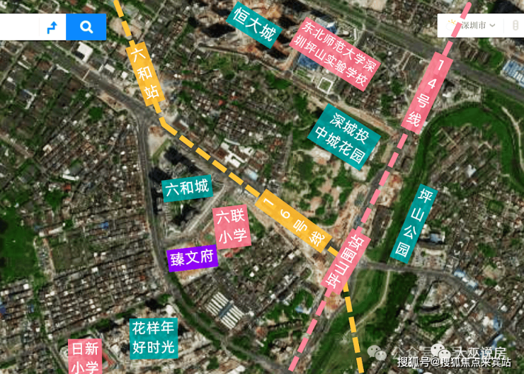 臻文府位于坪山中心区六和城旁边,东纵路与迎春路交汇处,项目北侧紧挨着一期六和城,东侧是六联小学,南侧是坪山综合批发市场,西南侧是花样年好时光。