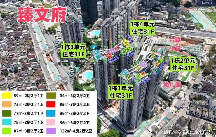 臻文府由坪山本地房企六和集团打造,也是六和城二期,总占地面积约0.92万㎡,总建筑面积约6.85万㎡,计容建筑面积约5.32万㎡,容积率5.76,绿化率25%,共由4栋总高31层住宅组成,分别是1栋/1/2/3/4单元,另外配建1所9班制幼儿园。