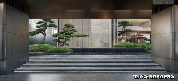 绿城打造桂语旗峰项目时针对小区入口和大堂,做了颜值与功能上的双重优化:首先,归家大门利用长围墙及超尺度雨棚打造水平约55米的超强延伸感,营造恢宏大气的归家场景;约18米深度打造多层次归家景观,酒店式归家入口到浪漫星空顶,再到前庭礼仪水院叠水景观+造型松,营造极具艺术造型感的过道空间,让每一步都能悦见不同归家景象。功能方面,完备的归家方式,让人行、车行、落客等每种出入方式都互不干扰。雅致优美的阵列景观、完备细腻的功能空间,让这一条“线”成为了具备丰富景观和功能内容的载体。