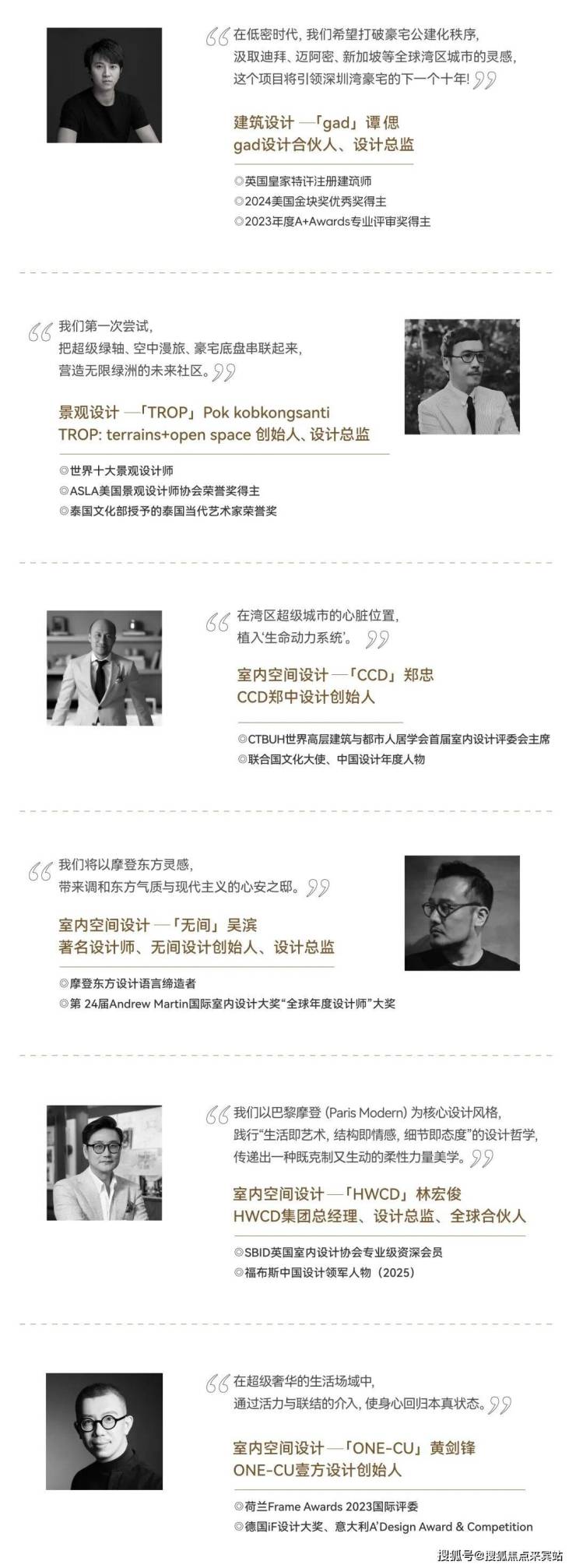 盛邀gad国际团队、TROP、CCD、无间、HWCD、ONE-CU等顶级设计资源,联袂打造深圳湾首个低密先锋豪宅。