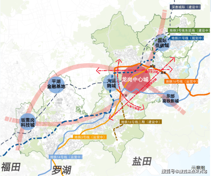 在龙岗发展一路向东的大趋势下,依托地铁3/16/14号线的轨道交通效能,“东部副中心”强势崛起,地铁16号线东轴方向成龙岗中心城外拓首站,“一芯两核多支点”战略赋能、超百万方城市更新推进,多重势能叠加,区域未来可期①。