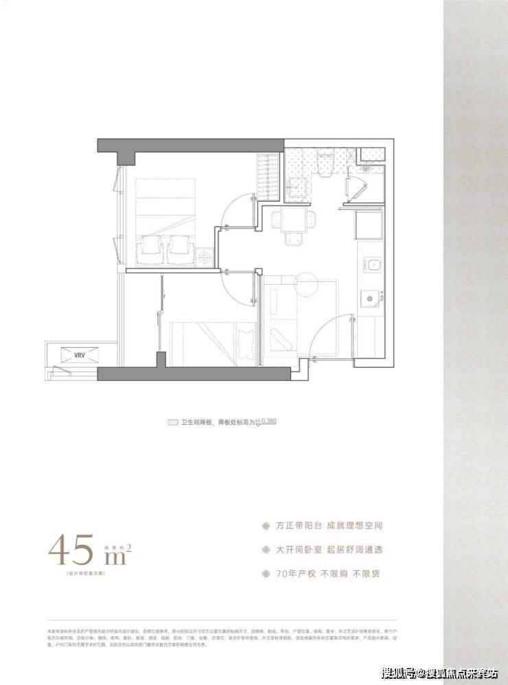 45-48平两房,主要特色是双卧室均有大面宽采光,明厨明卫,三分离卫浴设计,通透观景阳台提升空间感。