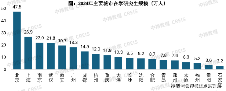 此外,相比本专科在校生,研究生规模往往更能代表各地教育质量。根据《2024年全国教育事业发展统计公报》,2024年我国在学研究生409.54万人,其中共有10城在学研究生数量超过10万人,分别是北京、上海、南京、武汉、西安、广州、成都、杭州、重庆和天津,其中北京研究生在学数量已达47.5万,远高于其他城市。庞大的研究生群体为这些核心城市的高端产业布局和创新发展提供了强劲的人才支撑。