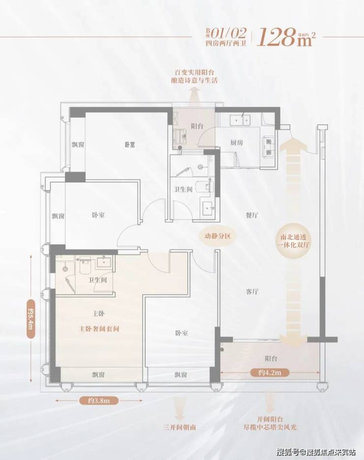 天宸128㎡户型图,双卫浴、双阳台设计,主卧大套房,空间开阔。