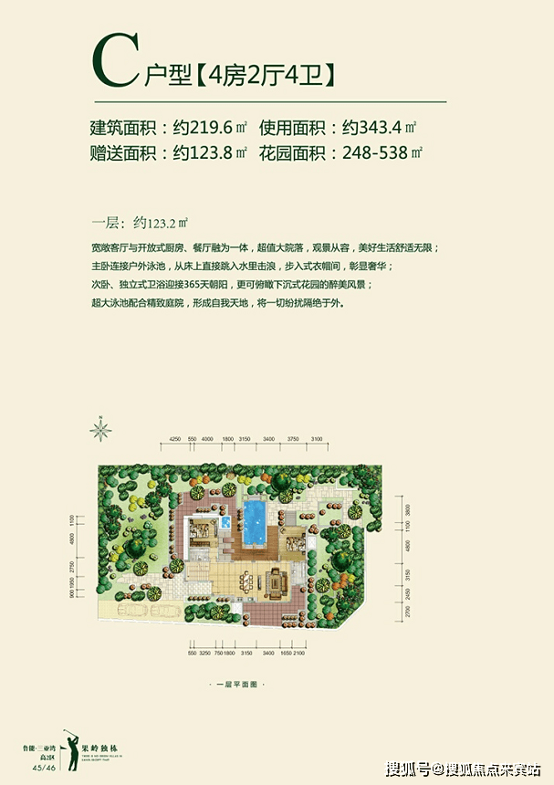 C户型,建面338平米(配带私家花园), 4F2T4W,总价约1220万~1264万
