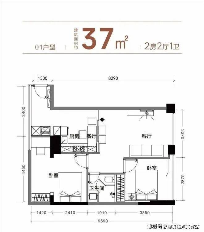 端头两面采光的01户型,建筑面积约37平两房一厅一卫,实际使用面积约64平,总价在580-630万。