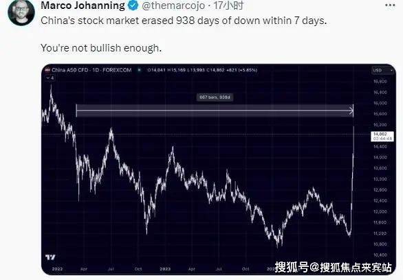 随着中国政府上周宣布了一系列刺激经济增长的措施,MSCI中国指数已从近期低点上涨了逾30%。A股和港股的成交量在本周一均创下历史新高。有海外投资者在社交媒体上以富时中国A50指数期货为例感慨称,中国股市在短短7天之内就抹去了938天的跌幅。