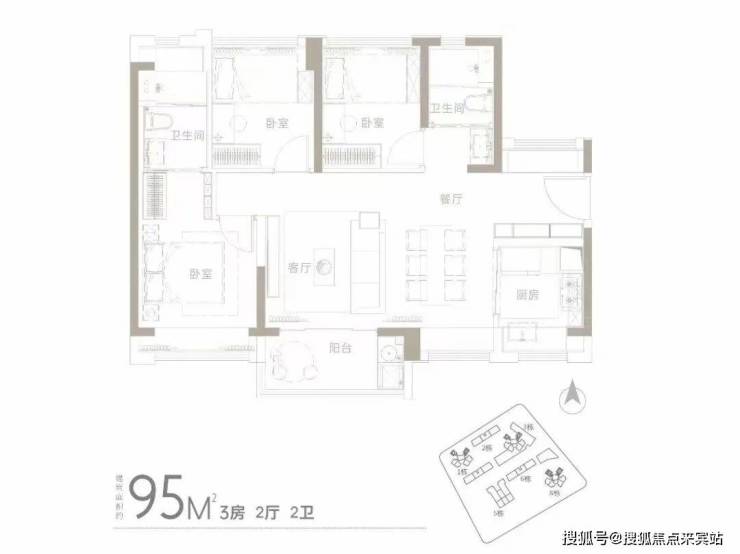 95㎡3房2厅2卫有横厅和竖厅两个格局,其中竖厅房源位于3栋和8栋,整体与83㎡相似;横厅位于1栋、3栋、8栋。