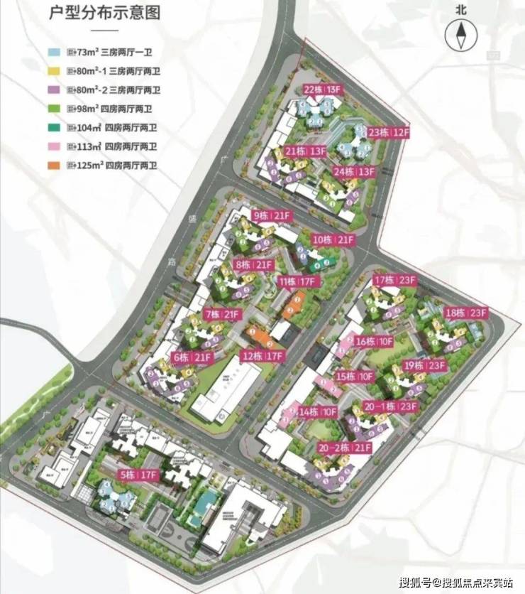 2号地块:6/7/8/9/10栋商品房21F,11/12栋商品房17F,13栋是幼儿园。