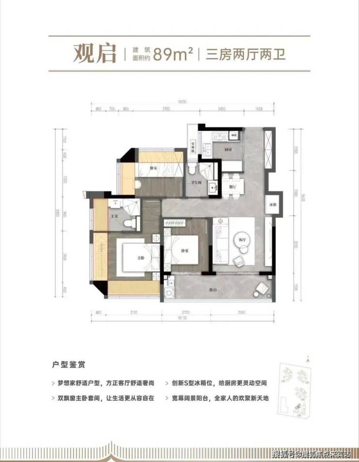 【建面约89㎡的三房两厅两卫】:竖厅格局,动静分区,厨房做的半开放式的,可开可合;景观双阳台连接次卧,还有一个次卧也是双飘窗;主卧带独立卫生间,空间也更大。