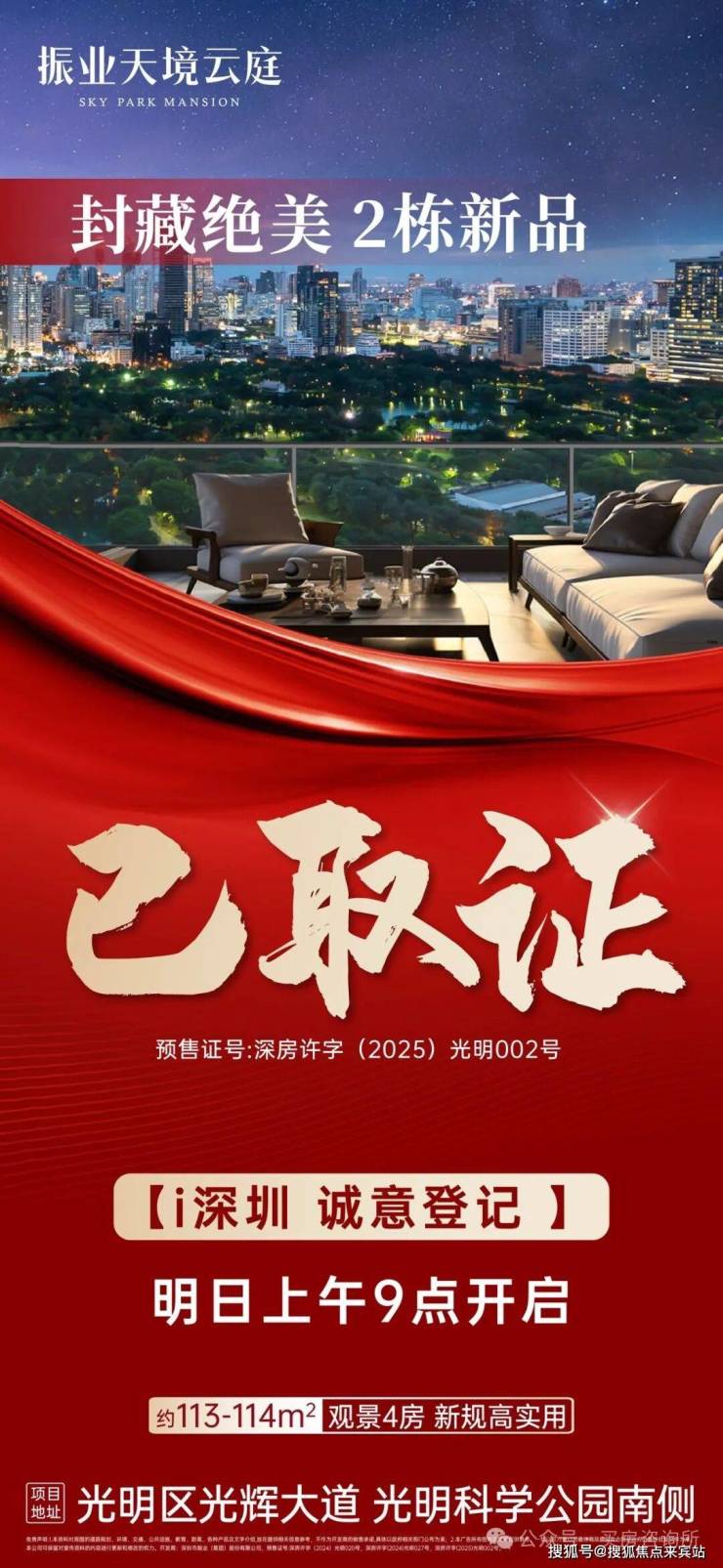 最新消息:“光明科学公园头排景观房,振业天境云庭加推2栋楼王刚刚已拿证,开盘约91折,折后单价4万/㎡起!计划3月23日开盘选房!约113㎡南北通4房,约114㎡双龙抱珠4房,