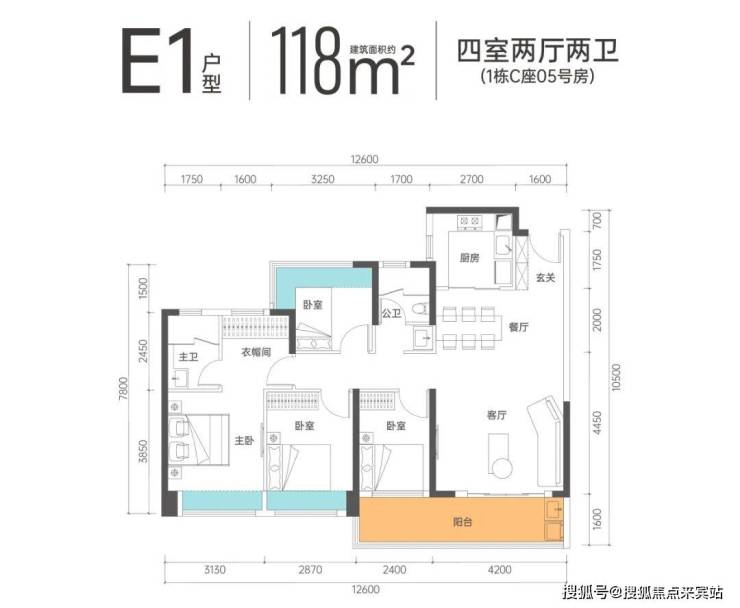E1户型-118㎡的4房2厅2卫,设计的竖厅格局,客厅4.2米开间,四开间朝南,客厅连着卧室,带6.6米长的大阳台,西南朝向。