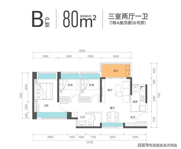 B户型-80㎡的3房1卫,设计的竖厅南北通透格局,客厅3.4米开间,L型厨房。