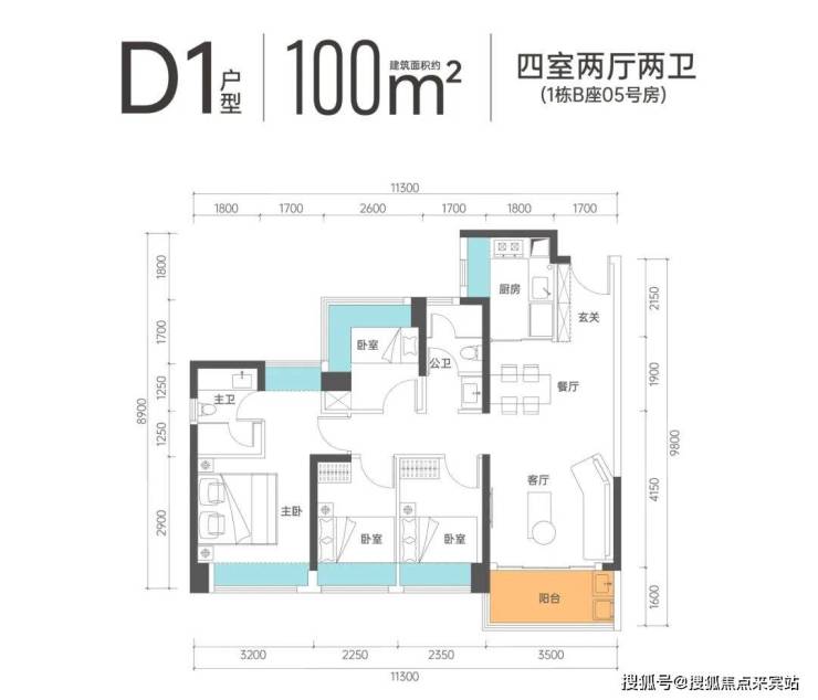 D1户型-100㎡的4房2厅2卫,设计的竖厅格局,客厅3.5米开间,四开间朝南,三分离卫生间,西南朝向。