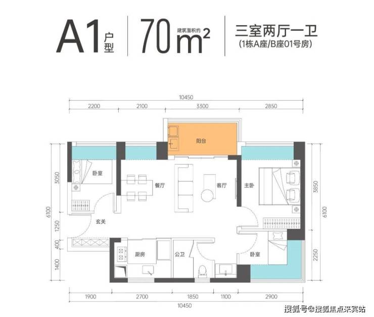 A1户型-70㎡的2房1卫,设计的竖厅格局,客厅3.3米开间,U型阳光厨房,有西南及东南朝向。