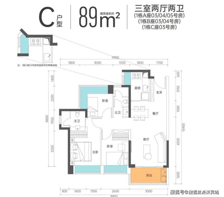 C户型-89㎡的3房2卫,设计的经典竖厅格局,客厅3.5米开间,餐客厅一体化,三开间朝南,三分离卫生间,有西南及东南朝向。