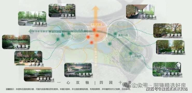 园林:百年山房,余荫留芳。园林设计结合附近山湖资源,将园林与映辰湖结 合在一起,创造性的打造出展示区“辰园十景”的园林节点与参观动线,最大 化的营造湖居生活的舒适。