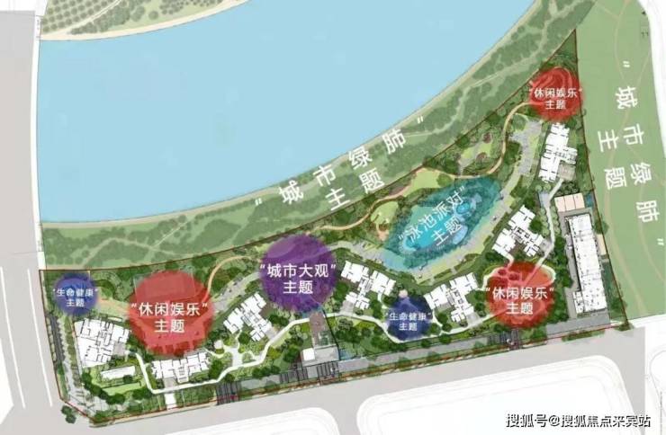 看下图,河湾公园的滨水景观带在家门口展开,一直延伸到整个项目。