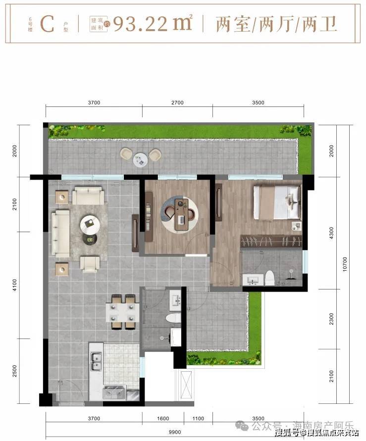 C户型约93㎡舒阔两房两厅两卫