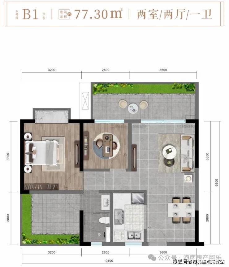 B1户型约77㎡舒适两房两厅一卫