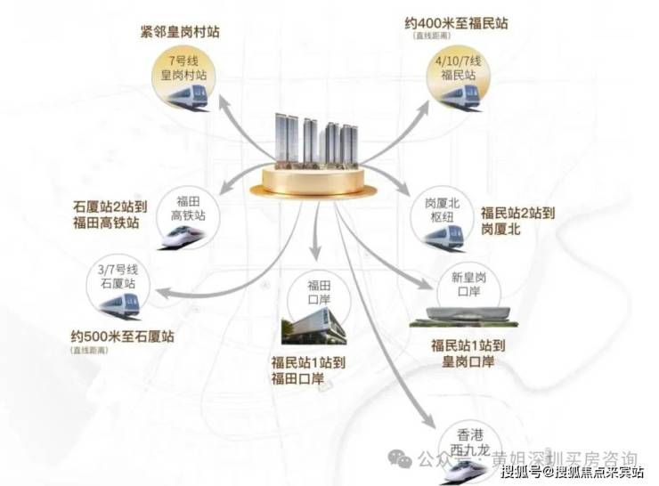 交通方面 地铁7号线 皇岗村站E/D口步行100米,4/10号线福民站300米,2站到皇岗口岸(香港通勤党狂喜)。