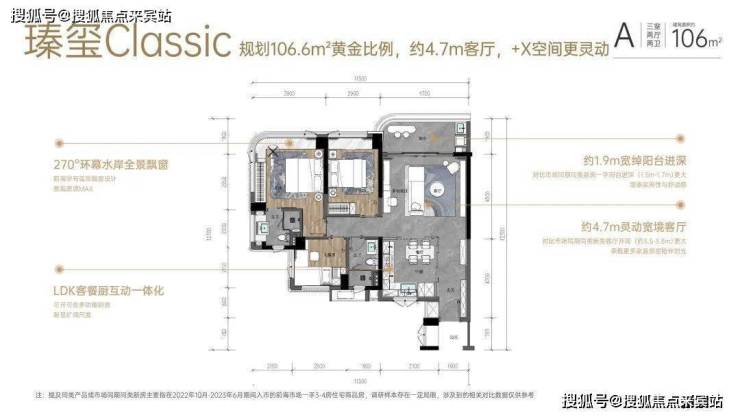 建面约106平3房为经典的竖厅设计,动静分区、双玄关入户、客厅出阳台、LDK一体化餐客厅、主卧带转角飘窗,实用又不失阔绰,秒杀市面上一众同等建面的3房。