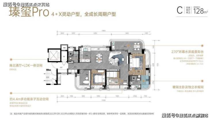 前海瑧玺建面约128平4房的户型图,每个空间不是凸窗就是阳台,有些还是两面凸窗,大幅扩展了实用空间,非常阔绰。