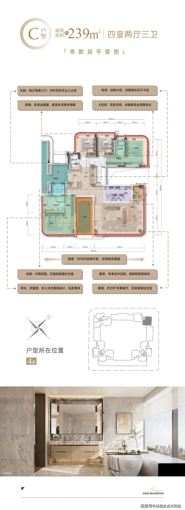 239㎡户型:泳池/花园入户顶奢空间,进阶版四室两厅三卫规划,享一梯一户、独立电梯厅、双玄关设计、LDKG一体化设计,享超17M阔绰面宽,标配中西岛台双厨和套房主卧,外加顶奢级泳池/花园入户配置,悦享归家即度假雅奢生活。