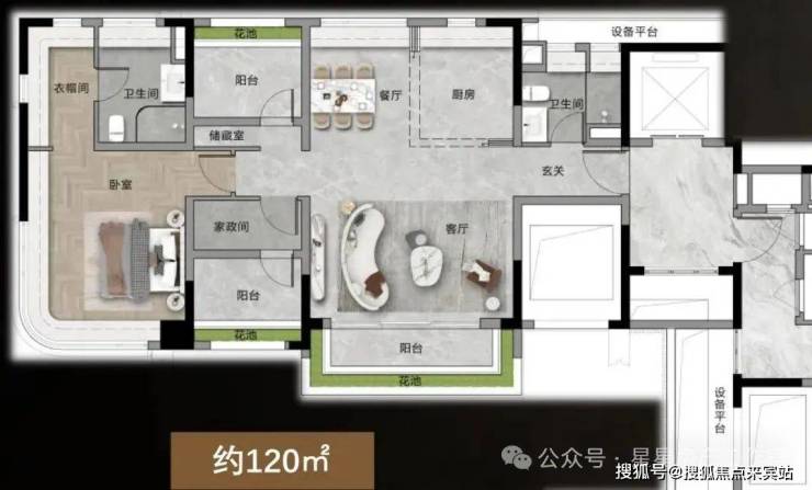 108㎡三房两厅两卫:西南朝向,竖厅设计,动静分区,有一个较大的入户花园,客厅主阳台有一个 270 度观景阳台,主人房也有一个 270 度弧形飘窗,视野采光一流。