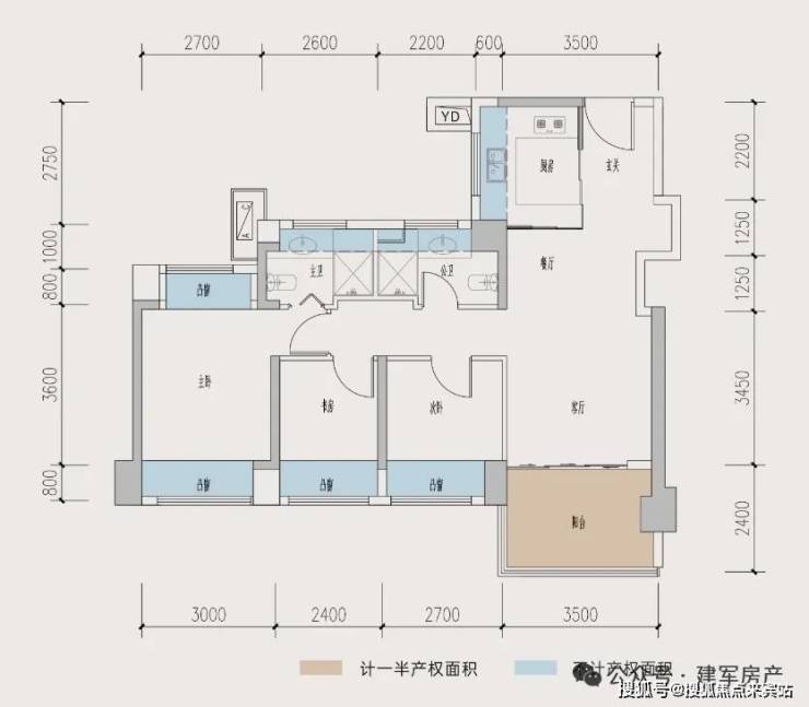 87㎡的3房2厅2卫,B户型,设计的是经典竖厅格局,进门入户玄关,客厅3.5米开间,LDKB一体化,动静分区,三开间朝南,S墙设计预留冰箱卡槽位,主卧+1个次卧270°飘窗,U型厨房,卫生间干湿分离,得房率约:77.4%(不含赠送),西南朝向。套内面积67.51㎡+赠送面积16.96㎡=实得84.47㎡,加上赠送得房率96.83%。