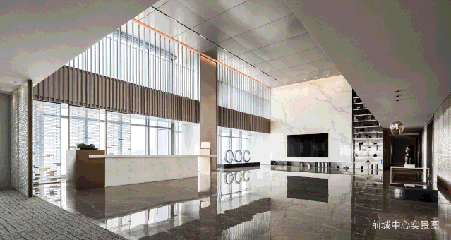 宏发前城中心,约750㎡高端品质大堂,约18米层高,超甲级配置,比深圳一般12米甲级写字楼配置高出逾一层,超乎想象的大尺度恢弘空间,营造非同反响的商务气度。地面、墙面全石材配置,为企业营造高端的第一形象。