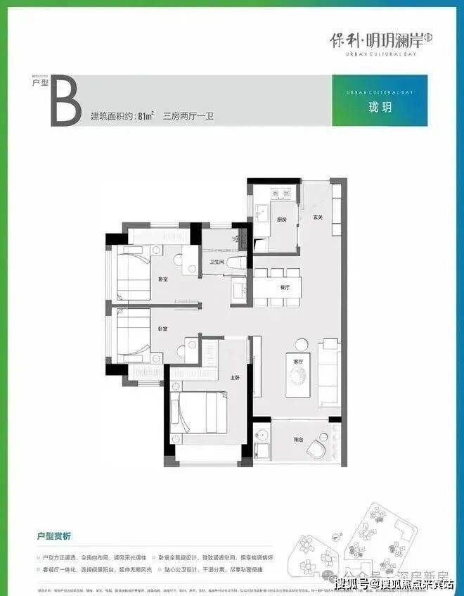 81㎡的3房2厅1卫,设计的是竖厅格局,客厅实测3.2米开间,LDKB一体化设计,进门独户玄关,动静分区,型厨房,卫生间三段式分离,得房率:75.6%(不含赠送),西南或东南朝向。