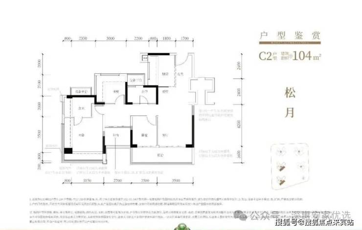 104㎡的4房2厅2卫,C1-C2户型,设计的是经典竖厅格局,进门入户玄关,客厅3.5米开间,LDKB一体化,S墙设计预留冰箱卡槽位,动静分区,四开间朝南,分别做到了主卧17.98㎡/次卧8.37㎡/次卧8.1m²/次卧7.75㎡(包含墙体飘窗),L型厨房,公卫干湿分离带1个约2m²的设备平台,得房率约79.2%(不含赠送),客厅连接次卧出9.6m²的观景大阳台,东南或西南朝向。套内面积82.58m²+赠送面积23.86m²=实用面积106.44m²,加上赠送后得房率约102.04%。