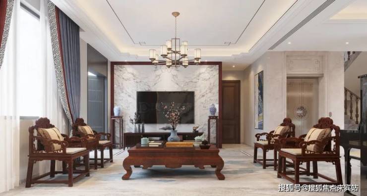 第一层的客厅特别强调空间的层次感,为了实现这种层次感,设计师用中式元素的红木沙发、柜子、背景画、帘子、灯具等等元素来划分层次。