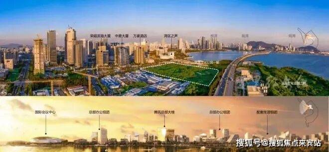 西侧隔海相望就是腾讯全球总部“互联网+”未来科技城,又叫做“企鹅岛”,位于深圳宝安区前海大铲湾岛,占地约130万㎡。