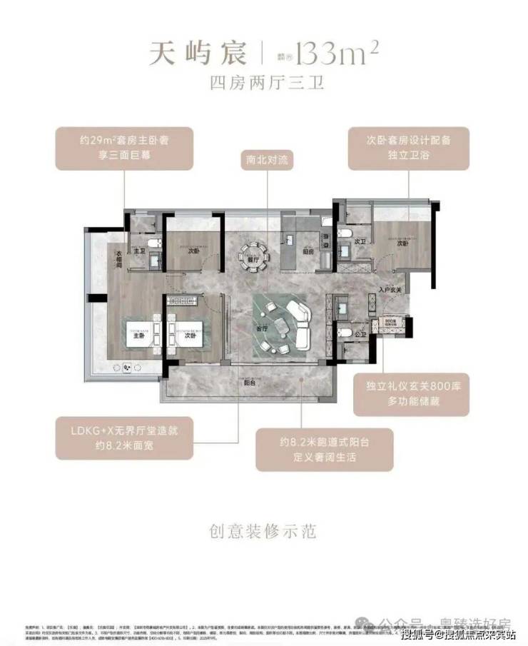 133㎡的4房2厅2卫,设计的是竖厅南北通透格局,进门入户玄关,客厅5.4米开间,餐客厅分离设计,客厅连接次卧出12.3m²的观景大阳台,L型中式+岛台灵动式厨房,公卫三段式干湿分离,得房率约78.27%(不含赠送),阳台主朝东南或西南向。靓点:超大客餐厅南北对流+8.2米长超大观景南向阳台,超大主卧+270°无柱转角飘窗