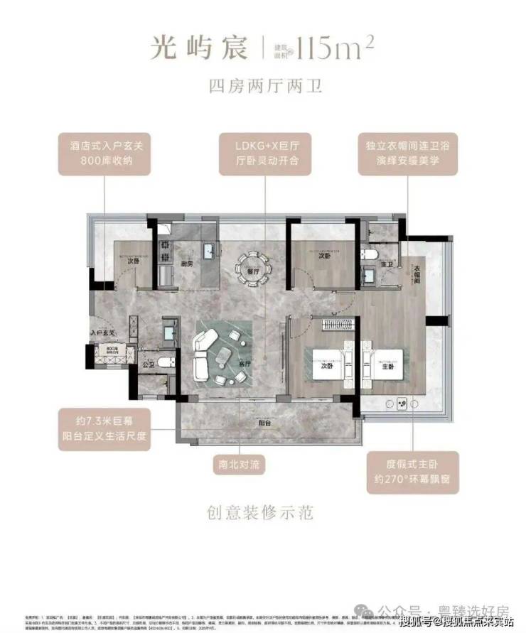 115㎡的4房2厅2卫,设计的是竖厅南北通透格局,进门入户玄关,客厅4.45米开间,餐客厅分离设计,客厅连接次卧出10.87m²的观景大阳台,L型中式+岛台灵动式厨房,公卫三段式干湿分离,得房率约78.27%(不含赠送),阳台主朝东南或西南向。靓点:南北对流+7.25米长超大观景南向阳台,超大主卧+270°无柱转角飘窗