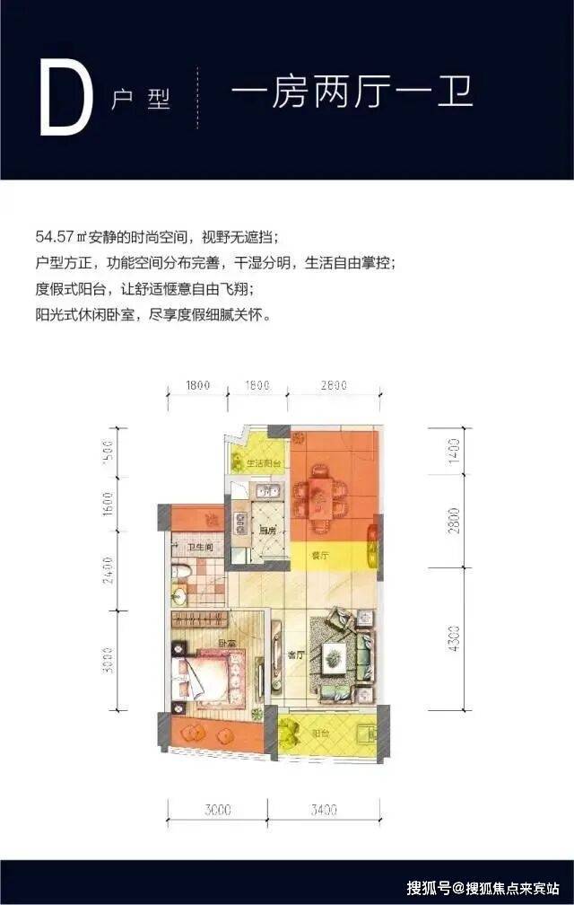 54.57㎡舒适安静的时尚空间;户型方正,功能空间分布完善,干湿分明,生活自由掌控;度假式阳台,让舒适惬意自由飞翔;阳光式休闲卧室,尽享度假细腻关怀。