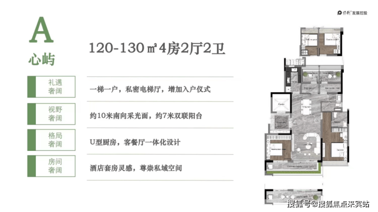 127-142平方米四房户型配备7米双联观景阳台,U型厨房与客餐厅一体化设计,主卧套房提升私密性。