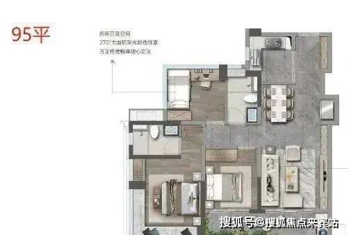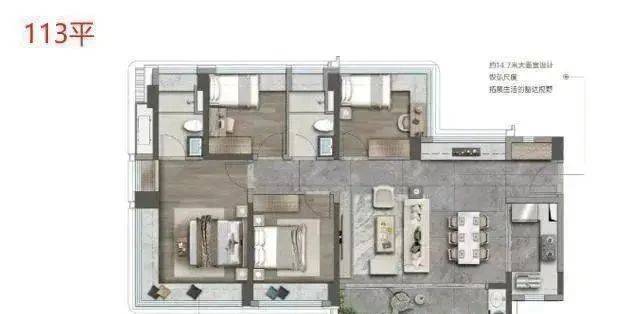 其95㎡、110㎡的产品客厅阳台连接到次卧,打造了较大的阳台空间;113㎡的产品,横厅设计,同样打造了大阳台。