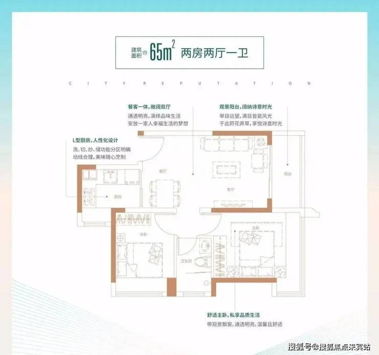 65㎡的2房2厅1卫:设计的竖厅格局,L型厨房,有朝西向及东向。