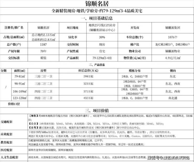 项目核心价值:锦顺名居(备案名:锦顺名居)作为锦顺集团在龙华观澜核心地段打造的地铁上盖TOD学府品质住宅,是“锦顺”系迭代作品,以建面约89–140㎡改善型住宅为主力,无缝接驳地铁4号线观澜站,依托深圳外国语学校(龙华校区)延伸学区资源及锦顺“锦顺”系精工体系,2026年市场定位于观澜片区兼具便捷交通、优质教育、生态宜居与品牌品质的标杆改善资产。项目位于龙华区观澜街道观澜大道与环观南路交汇处,总占地约3.0万㎡,总建面约13.5万㎡,容积率约4.0,绿化率约38%,规划6栋高层住宅,总户数约700户,车位比约1:1.2,物业为锦顺物业,物业费约4.5元/㎡/月,预计2027年底精装交付,产权70年。