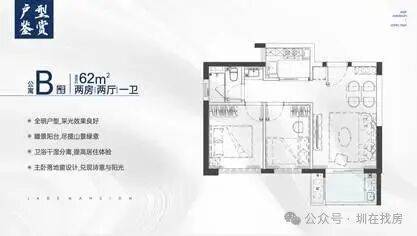 约62㎡户型:实现两房两厅一卫功能配置,独立明厨和三分离明亮卫浴,主卧可放置2米双人床