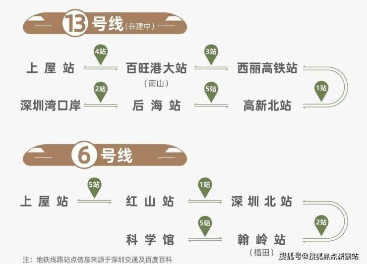 项目约直线距离400米抵达6号线、13号线(在建中)上屋站,6号线8站福田(翰岭站),13号线(建设中)4站南山、8站科技园(高新北站)。
