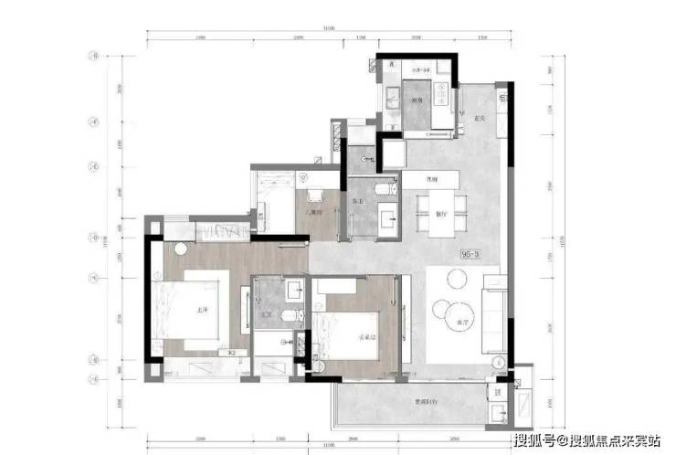 95㎡户型:沿用三房两厅两卫的高效集约布局,LDK一体化,形成U型厨房科学流线,1.5面宽的景观阳台与客厅和餐厨相连接,高透的玻璃窗无形中增加了空间的视觉延伸。家具嵌入式设计和主卧小家化设计,提供优质的人性化体验,让生活空间更加宜居适度。