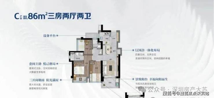 86㎡的3房2厅2卫,设计的是经典竖厅格局,客厅3.2米开间,入户玄关八宝库,LDKB一体化,S墙设计预留冰箱卡槽位,动静分区,三开间朝南,U型厨房,公卫三段式分离,还送1个设备平台,得房率约75.9-76.6%(不含赠送),西南或东南朝向。