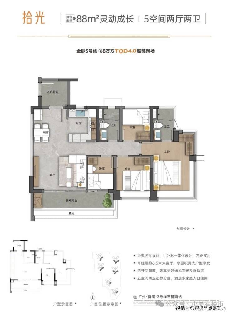优点:交通比较好,距离地铁3号线石碁南站不算远,坐地铁去珠琶、万博都是一小时内,新规户型,73平做到了三房两卫,而且还是南向,上车门槛较低,这个户型总价145万起就可以买到,教育资源不错,小区自带幼儿园和九年一贯制中小学,已经确定引入广外附校,大盘生活配套齐全,自身配建4000方商业。