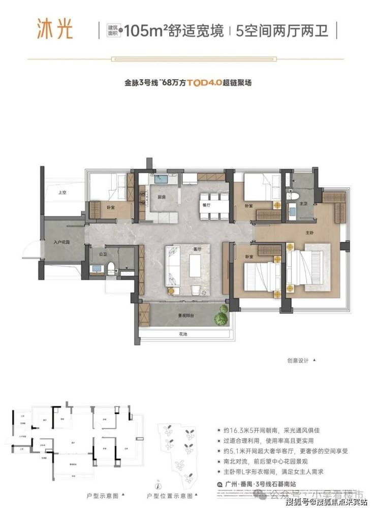 建面105平四房两卫,五开间朝南,约16.3米大面宽,前后望中心园林景观,整个LDKB有49平,主卧带L型衣帽间,三面采光,总价235-259万左右。