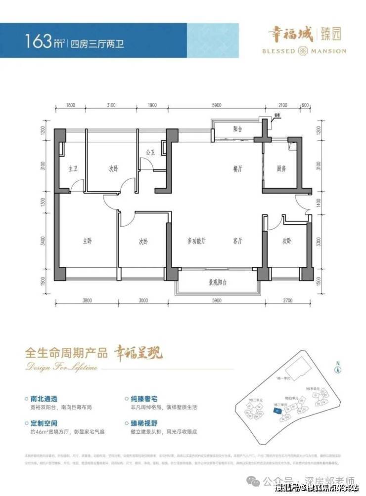 设计的是横厅南北通透格局,进门入户玄关,客厅5.9米开间,餐厨一体化设计,南北双阳台,全屋6个飘窗面,4个卧室分别做到了主卧18.31㎡/次卧12.4㎡/次卧10.15㎡/次卧9.45㎡(包含墙体飘窗),客厅出5.9米长的观景大阳台,U型厨房,公卫三段式分离,得房率约87.1%(包含赠送),阳台主朝东南向。
