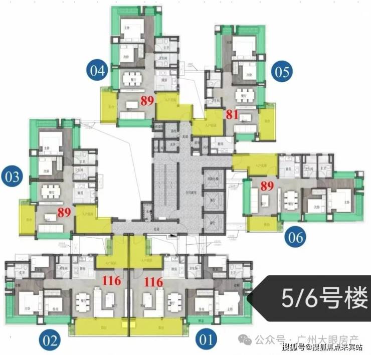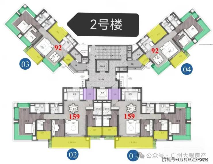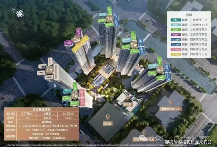 保利招商华发中央公馆采用了围合式设计,6栋47层高塔楼设计,小区自身配建有文化体育场馆和幼儿园,除了2#楼王是两梯四户,其余均为三梯六户,8#是5层高的文化馆,9#是配建3层高的幼儿园。